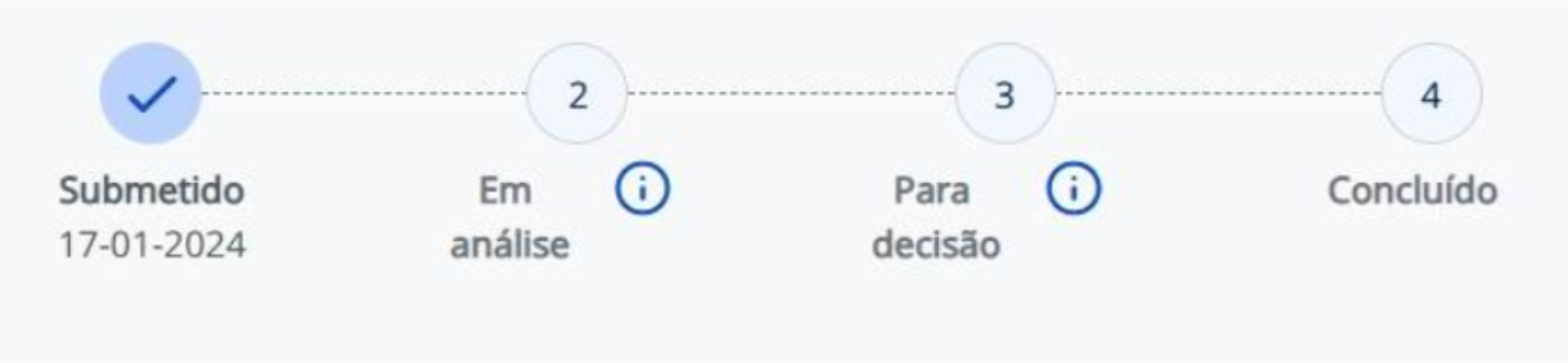 O ícone com o “i” significa “informação”, ou seja, ele apenas explica sobre o que se trata aquela fase, não significa que o processo já está nessa etapa. O que determina a etapa em que o processo se encontra é o ícone de “check” acima do nome da fase.
