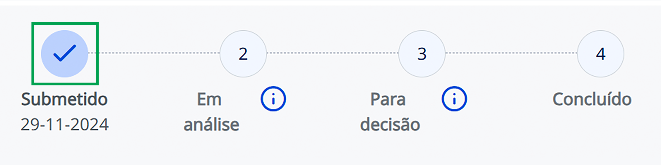 O seu processo estará na etapa que está com o tom em azul mais escuro com um “check”, conforme circulamos em verde na imagem abaixo.