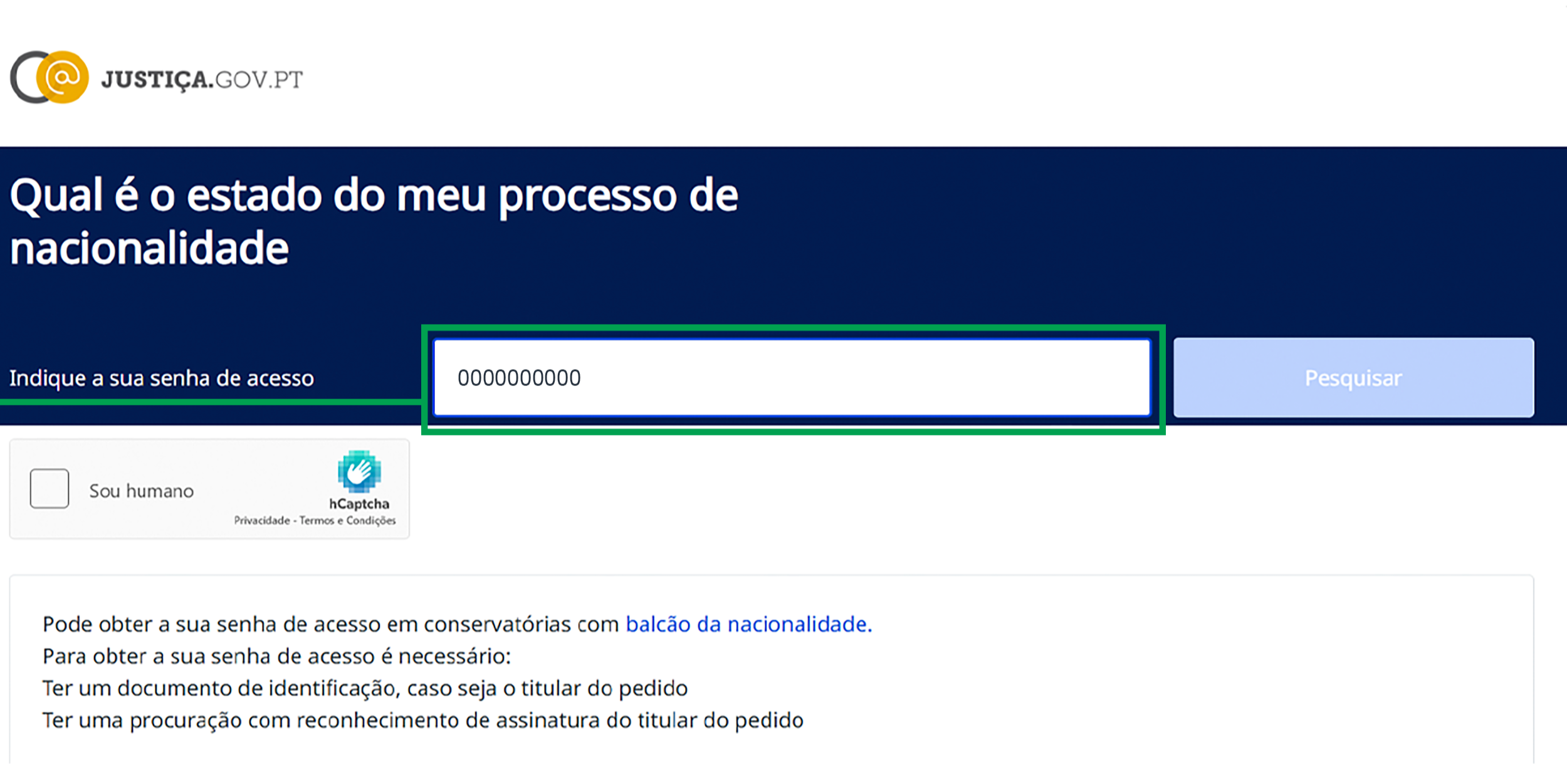 Você deve solicitar a senha em um Balcão da Nacionalidade ou por meio da Linha de Registos: (+351) 211 950 500. Neste caso, será necessário indicar o número de processo e os seus dados de identificação.
